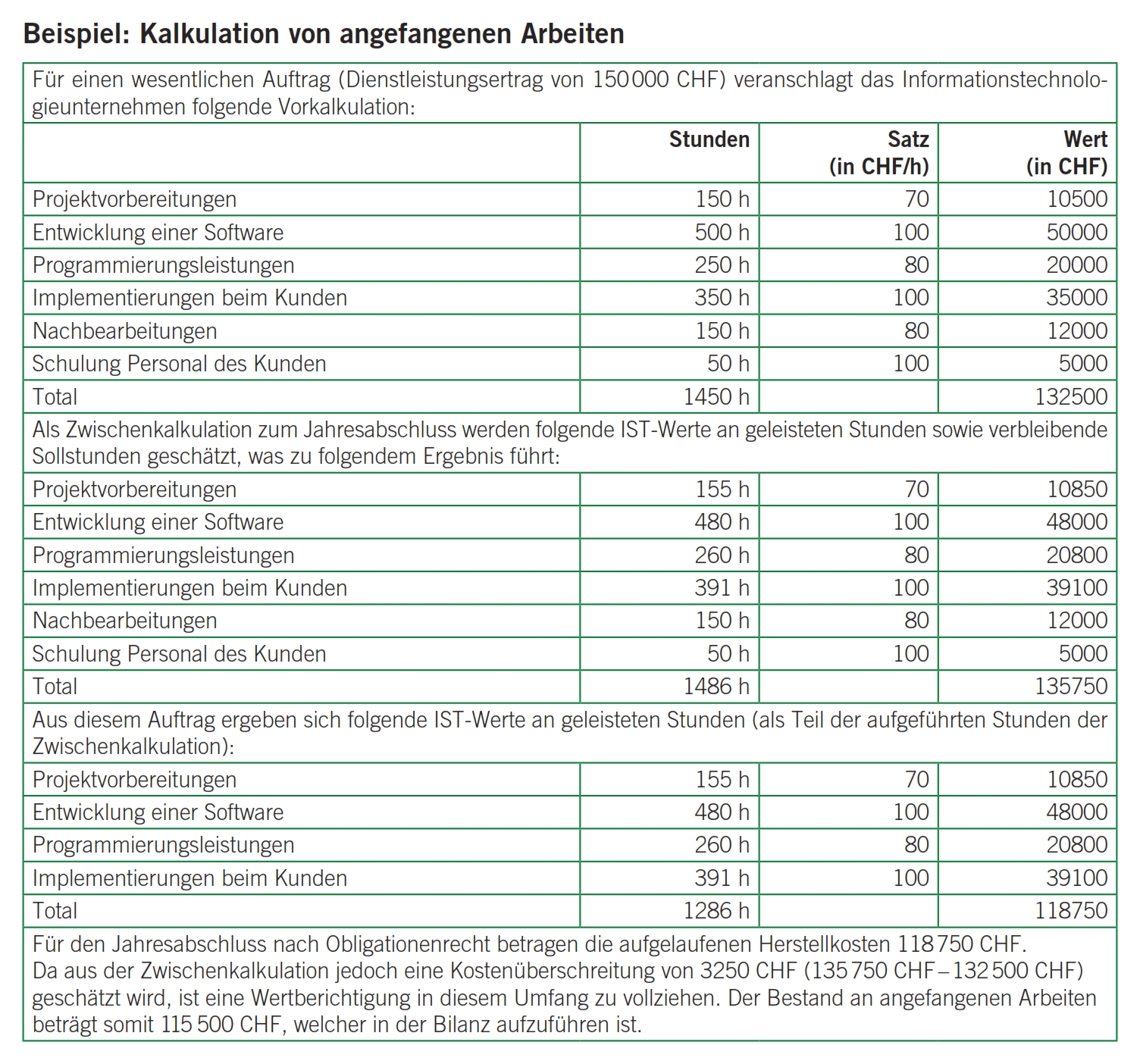 Wertminderungen sind beim Vorliegen von zu vielen Projektstunden und geringer Chance von Weiterverrechnung von geleisteten Zusatzaufwendungen an den Kunden zu berücksichtigen. Aufgrund des Imparitätsprinzips sind solche Wertminderungen zeitnah zu vollziehen. Die Feststellung von Wertminderungen setzt allerdings voraus, dass für Dienstleistungen, Projekte oder Mandate regelmässig eine Vor-, Zwischen- und Nachkalkulation besteht. Für einen Jahresabschluss bedarf es daher einer Zwischenkalkulation. Für die Zwischenkalkulation sind die geleisteten Ist-Stunden (effektive Stunden) sowie die notwendigen verbleibenden Soll-Stunden zu schätzen (vgl. Beispiel).