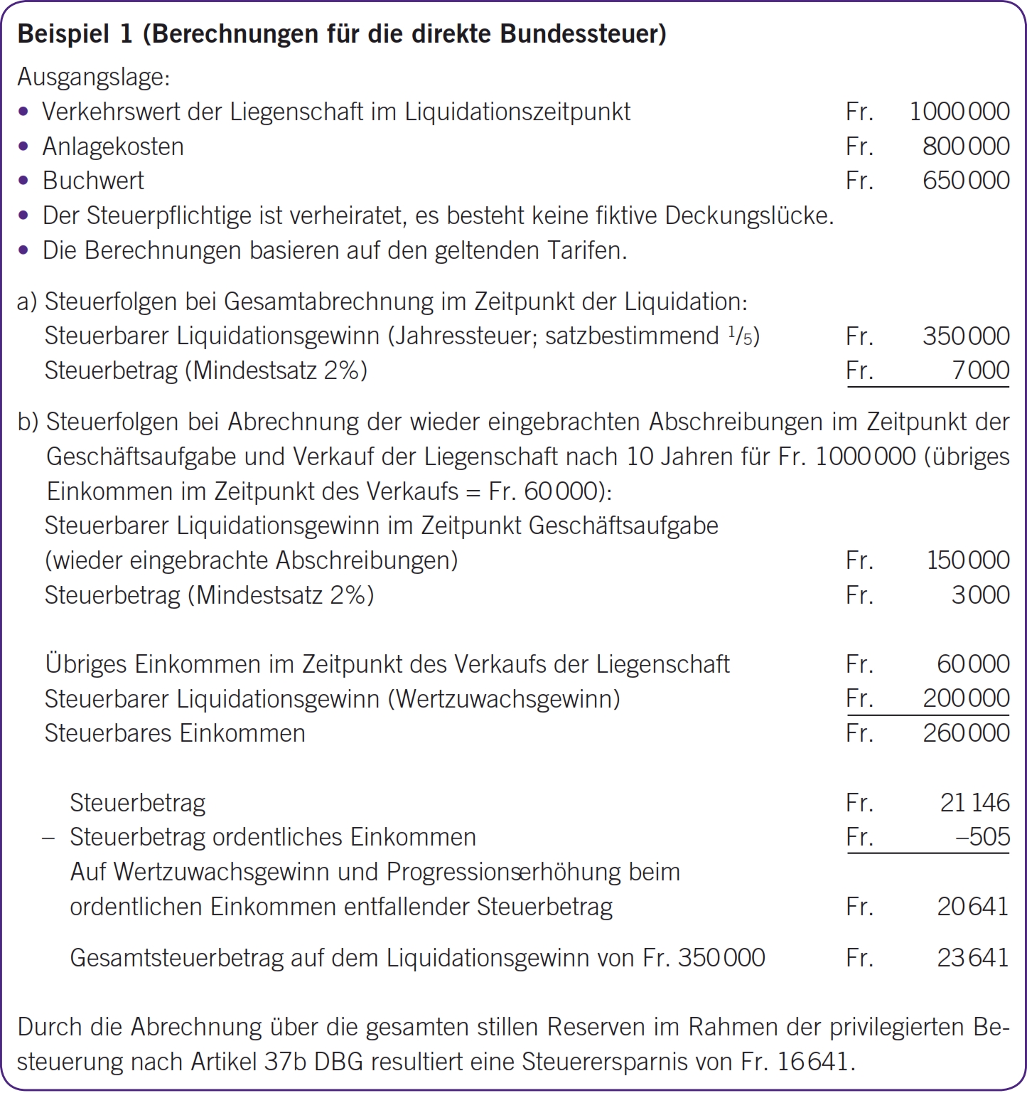 Sofern es die finanziellen Verhältnisse im Zeitpunkt der Geschäftsaufgabe zulassen, ist es steuerlich vorteilhaft, bei der Überführung einer Geschäftsliegenschaft ins Privatvermögen nicht nur über die wieder eingebrachten Abschreibungen, sondern auch über den Wertzuwachsgewinn im Rahmen der privilegierten Besteuerung nach Artikel 37b DBG abzurechnen (siehe Beispiel 1).