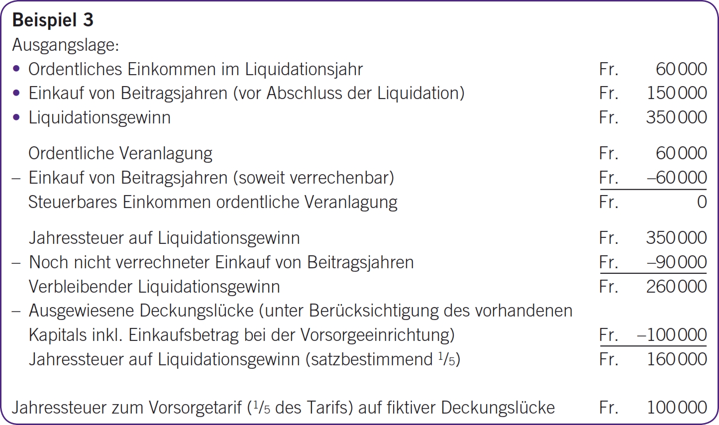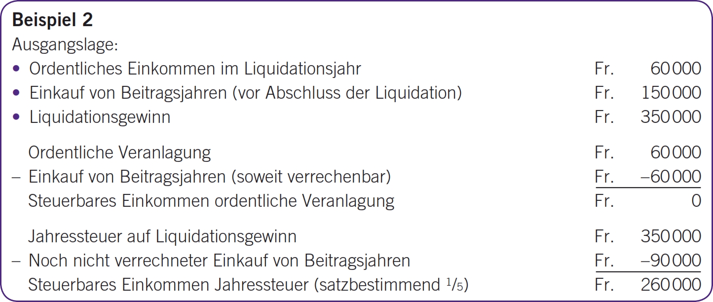 Wenn die selbständig erwerbende Person sich freiwillig einer Einrichtung der beruflichen Vorsorge angeschlossen hat, so können fehlende Beitragsjahre bis zum Abschluss der Liquidation nach den reglementarischen Bestimmungen eingekauft und steuerlich in Abzug gebracht werden (Artikel 33 Absatz 1 Buchstabe d DBG). Dabei gilt der Grundsatz, dass solche Einkäufe primär vom ordentlich besteuerten Einkommen in Abzug zu bringen sind. Wenn der getätigte Einkauf nicht vollständig mit dem ordentlichen Einkommen verrechnet werden kann, ist der überschiessende Teil vom separat zu besteuernden Liquidationsgewinn in Abzug zu bringen. Damit wird sichergestellt, dass ein allenfalls aus dem Liquidationsgewinn finanzierter grösserer Einkauf steuerlich nicht in eine Lücke fällt (siehe Beispiel 2).