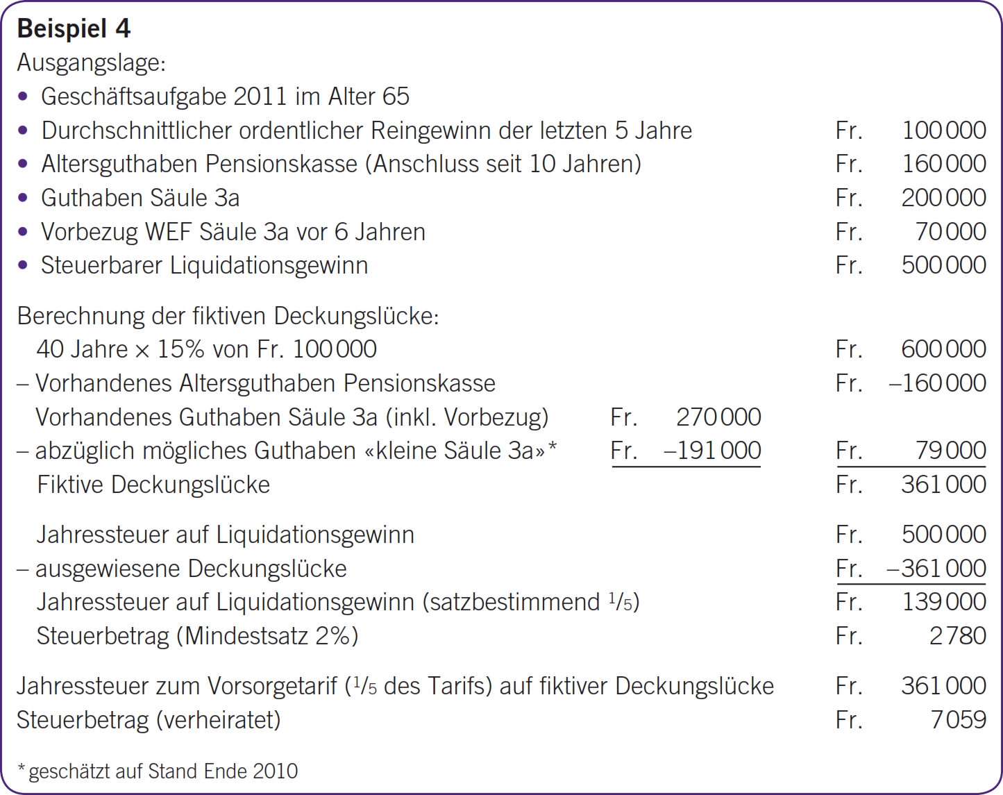 Die Steuerbelastung bei den kantonalen Steuern richtet sich einerseits nach der Ausgestaltung des jeweiligen Steuertarifs für die Besteuerung von Vorsorgeleistungen (fiktive Deckungslücke) und anderseits nach der Ausgestaltung der Jahressteuer auf dem restlichen Liquidationsgewinn. Der anwendbare Satz bestimmt sich nach kantonalem Recht.