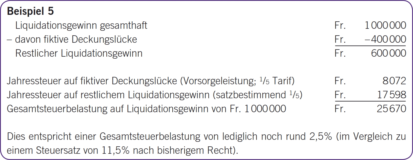 Auch relativ hohe Liquidationsgewinne erfahren nach Artikel 37b DBG im Vergleich zur heutigen Regelung eine sehr bescheidene Besteuerung. Zur Illustration mag das Beispiel 5 dienen (verheiratete Person, Steuerberechnung nach den geltenden Tarifen).