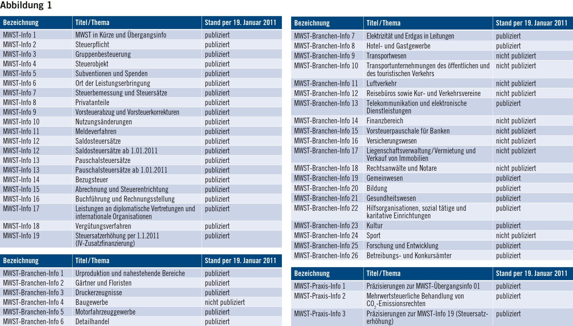 Bezüglich der neuen Regelungen verweisen wir auf den Fachbeitrag im TREX, Ausgabe 5/2010, «Das neue MWSTG – Erste Erfahrungen, 3. Praxisänderung im Baugewerbe».