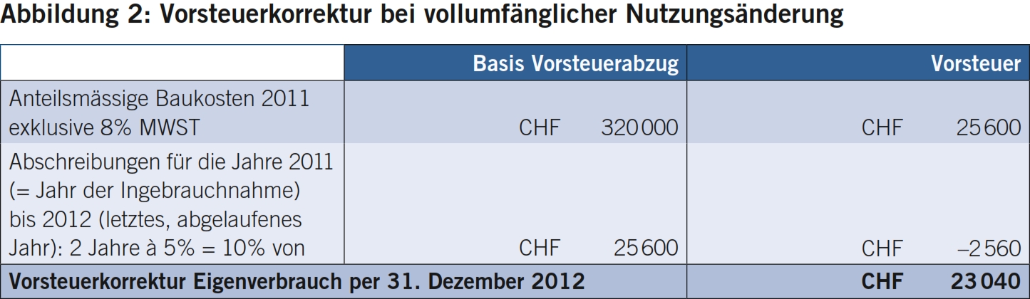 Am 1. Januar 2013 wird eine Einheit im Stockwerkeigentum, die bis 31. Dezember 2012 mit Option an das Unternehmen U vermietet wurde, an eine Privatperson verkauft (für eine private Nutzung). Demnach liegt eine vollumfängliche Nutzungsänderung per 31. Dezember 2012 vor. Das Handelsunternehmen nimmt auf dem Zeitwert der steuerlich relevanten (wertvermehrenden) Aufwendungen und im Umfang der geltend gemachten Vorsteuern eine Vorsteuerkorrektur Eigenverbrauch vor. Bei anteilsmässigen Baukosten exklusive 8% MWST von CHF 320 000 berechnet sich die Vorsteuerkorrektur wie in Abbildung 2 dargestellt.