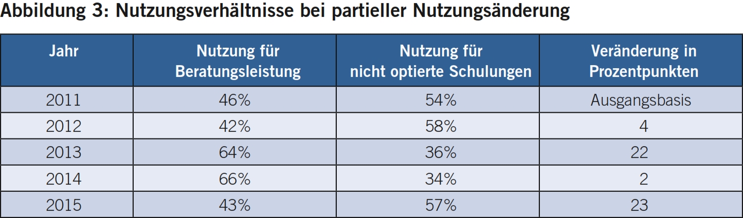 Bei annäherungsweiser Ermittlung der partiellen Nutzungsänderung liegen steuerlich relevante Nutzungsänderungen per 1. Januar 2013 und per 1. Januar 2015 vor. Die Toleranzgrenze von 20 Prozentpunkten wird – jeweils verglichen mit dem Vorjahr – in diesen beiden Jahren überschritten (siehe Abbildung 3). In der Abbildung 4 sind die einzelnen Berechnungen nun ersichtlich.