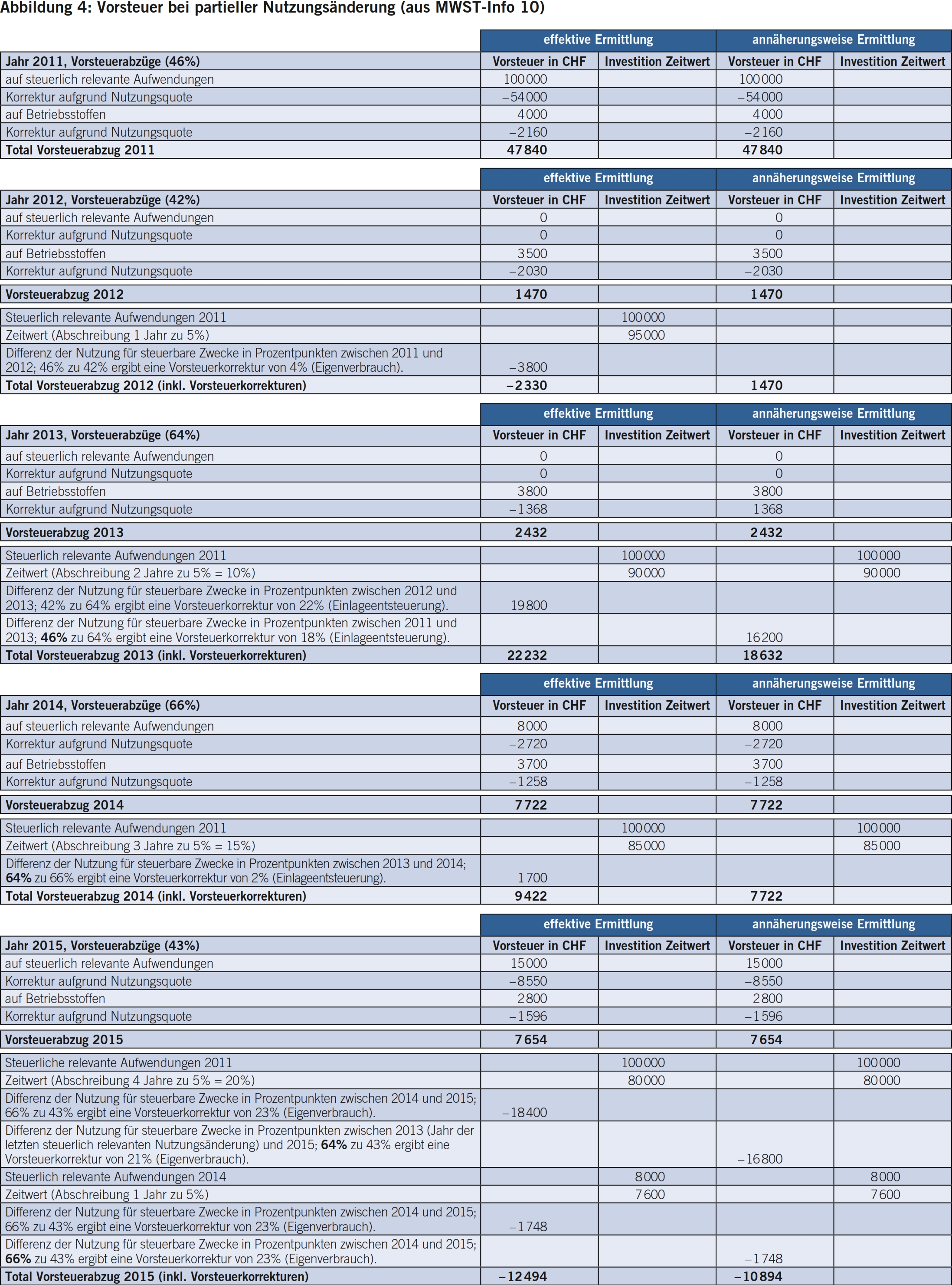 - Jahr 2011: Vorsteuern auf dem Erwerb der Liegenschaft von insgesamt CHF 100 000; Vorsteuern auf werterhaltenden Aufwendungen (Unterhalt) und Betriebsstoffen CHF 4000;