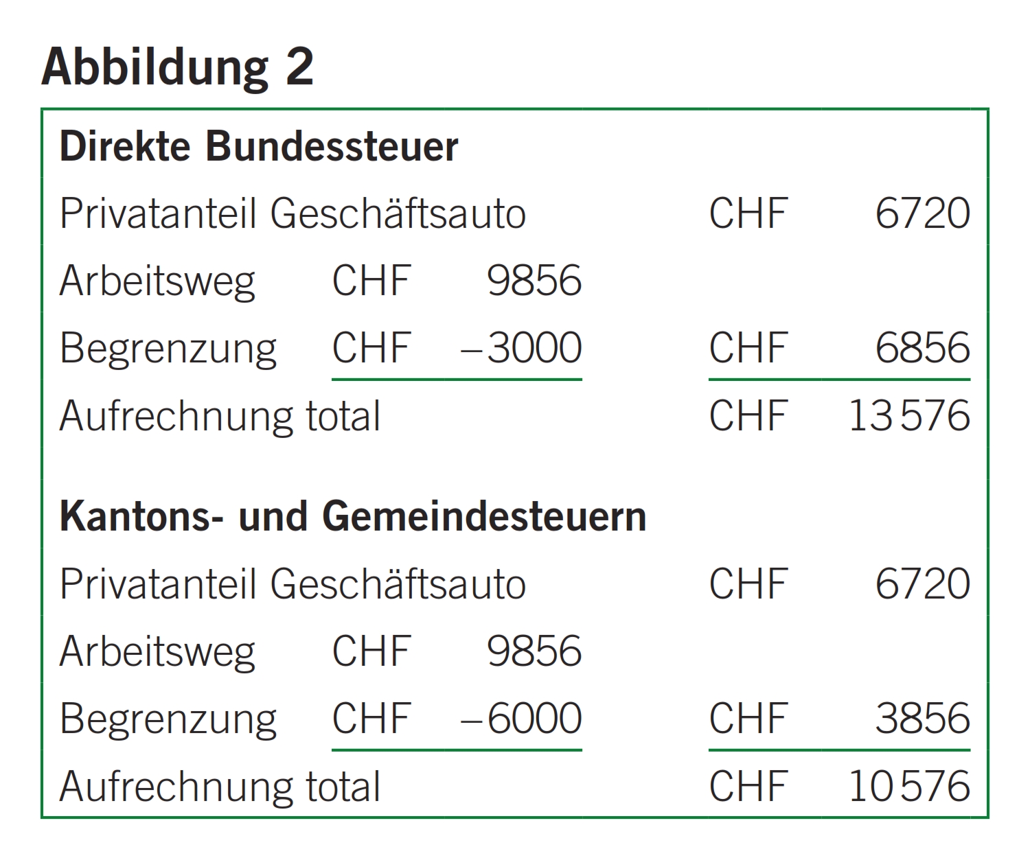 Geht man in unserem Beispiel davon aus, dass Herr Müller geschäftlich oft unterwegs ist und deshalb ein Geschäftsauto hat, so kann Herr Müller die privat gefahrenen Kilometer mittels Erfassungen im Bordbuch oder mit der Pauschalmethode abrechnen. Unter der Annahme, dass der Anschaffungspreis des Fahrzeugs 70 000 CHF (exkl. MWST) beträgt, so ist der Privatanteil bei 6720 CHF pro Jahr anzusetzen. Dieser Betrag von 6720 CHF ist, sofern Herr Müller diesen Betrag der Arbeitgeberin X AG nicht bezahlt, als steuerbare und sozialversicherungspflichtige Gehaltsnebenleistung auf dem NLA zu deklarieren. Ferner kann Herr Müller keinen Abzug für den Arbeitsweg geltend machen.