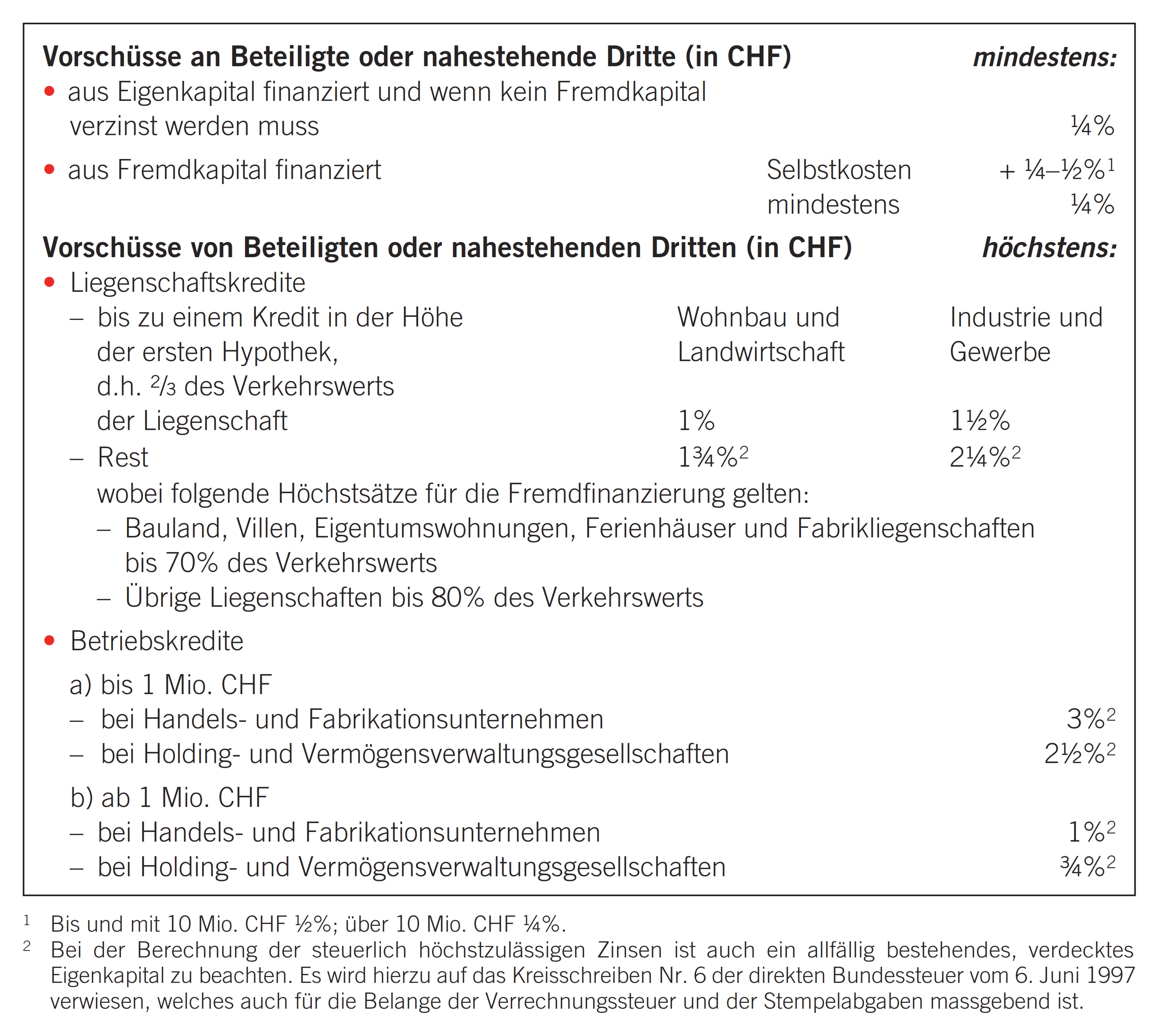 Für die Bemessung einer angemessenen Verzinsung von Vorschüssen oder Darlehen in Schweizer Franken an Beteiligte oder ihnen nahestehende Dritte oder von Beteiligten oder ihnen nahestehenden Dritten stellt die Eidgenössische Steuerverwaltung (ESTV) seit dem 1. Januar 2015 auf die folgenden Zinssätze ab (siehe Tabelle).