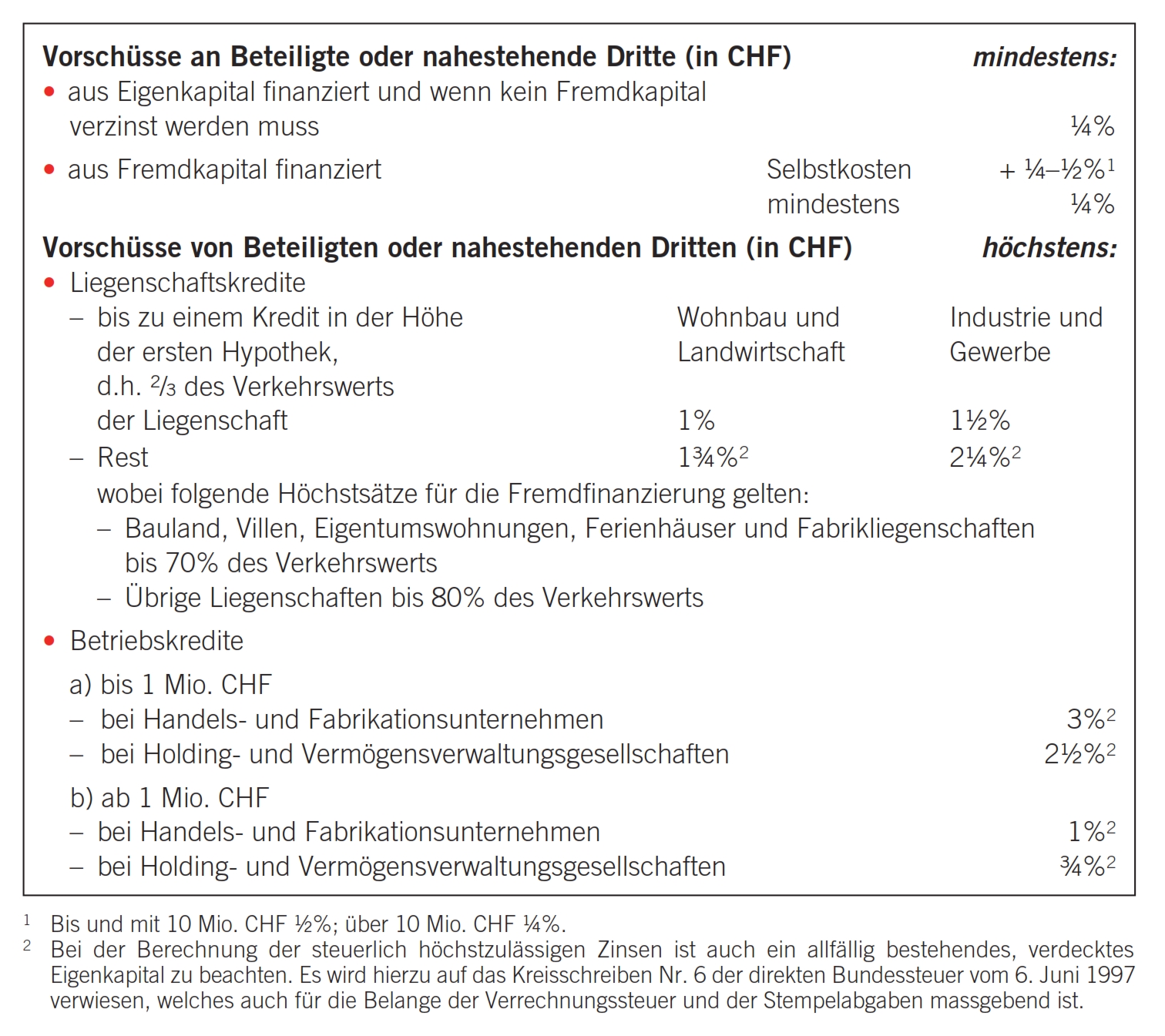 Für die Bemessung einer angemessenen Verzinsung von Vorschüssen oder Darlehen in Schweizer Franken an Beteiligte oder ihnen nahestehende Dritte oder von Beteiligten oder ihnen nahestehenden Dritten stellt die Eidgenössische Steuerverwaltung (ESTV) seit dem 1. Januar 2018 auf die folgenden Zinssätze ab (siehe Tabelle).