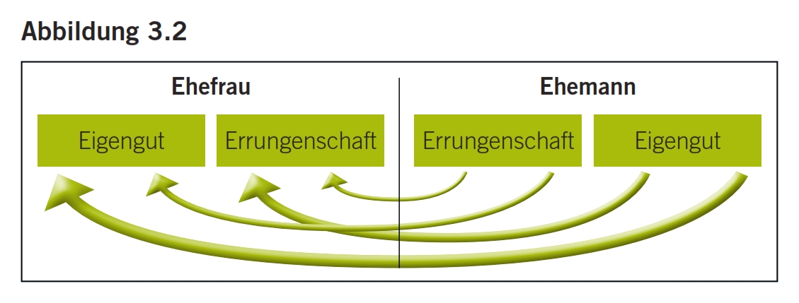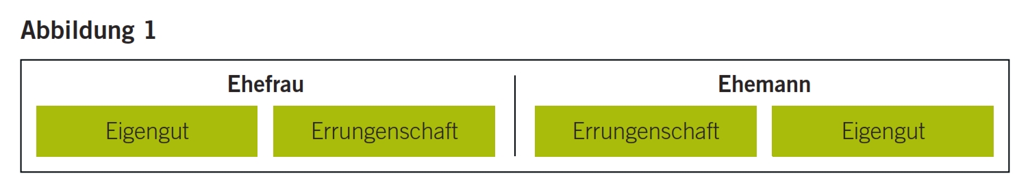 Bei der Errungenschaftsbeteiligung unterscheidet man zwischen dem Eigengut und der Errungenschaft der Ehefrau und dem Eigengut und der Errungenschaft des Ehemanns. Es existieren mithin total vier Gütermassen (vgl. Abbildung 1).