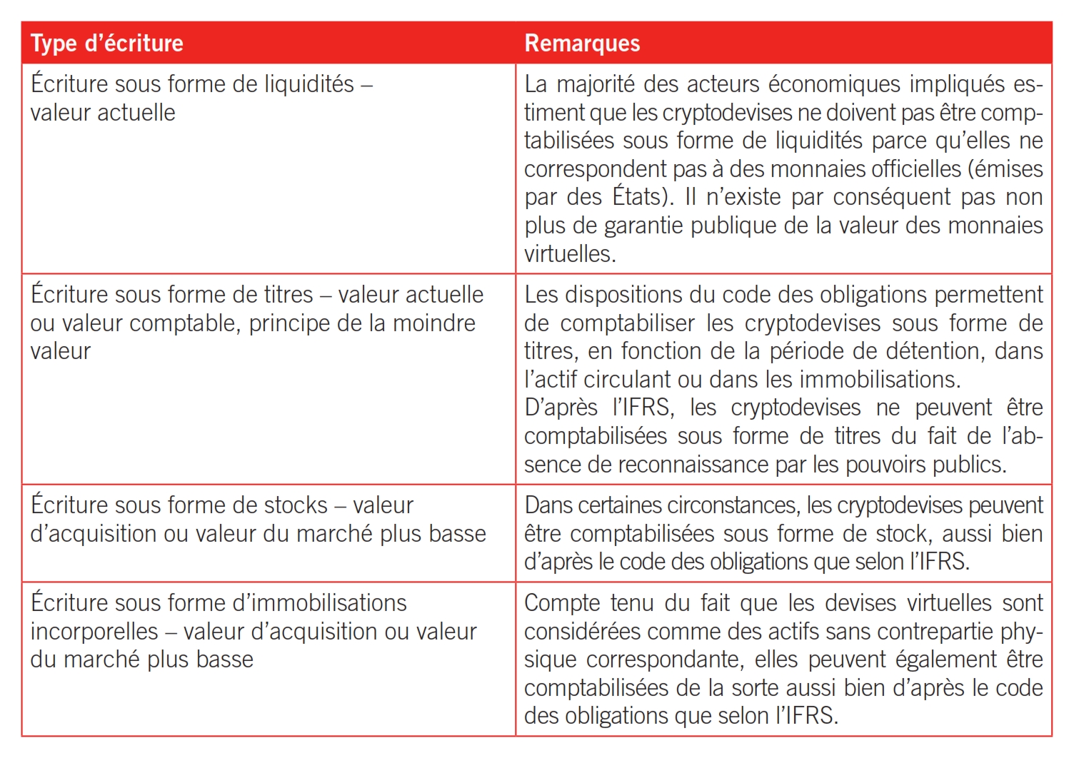 Avec la demande de cryptodevises se pose la question de l’écriture pour les entreprises dont les comptes comportent de tels produits découlant d’applications de la blockchain. Des principes d’évaluation différenciés s’appliquent en fonction du type d’écriture. À l’heure actuelle, le problème réside dans le fait que ni le code des obligations ni aucune norme nationale ou internationale de présentation des comptes ne prévoient de règles concernant l’inscription au bilan de cryptodevises. Le principe de précaution importe toutefois. Il s’accompagne du principe de la moindre valeur (évaluation à la valeur la plus basse du marché), du principe de réalisation (publication du résultat uniquement après la réalisation effective) ainsi que, en particulier, du principe d’imparité. Ce dernier prévoit que les pertes doivent être indiquées dès qu’elles sont prévisibles. En d’autres termes, des pertes imminentes doivent s’accompagner de provisions. La Conférence suisse des impôts (CSI) recommande de traiter les bitcoins comme d’autres comptes de devises. Ceux-ci sont convertis dans la monnaie de la comptabilité, les éventuelles différences de cours devant être enregistrées dans les comptes. Compte tenu de la forte volatilité du cours des bitcoins, c’est-à-dire des cours de change très variables et soumis à de grandes fluctuations par moments, cela implique une surveillance et un ajustement constants. De plus, les cryptodevises peuvent être échangées contre d’autres devises sur de nombreuses plateformes au cours de change libre, des cours de change homogènes n’étant par conséquent pas disponibles. Pour définir la valeur imposable, l’administration fédérale des contributions (AFC) calcule un prix moyen, à savoir la moyenne arithmétique des cours des diverses plateformes de négoce.
