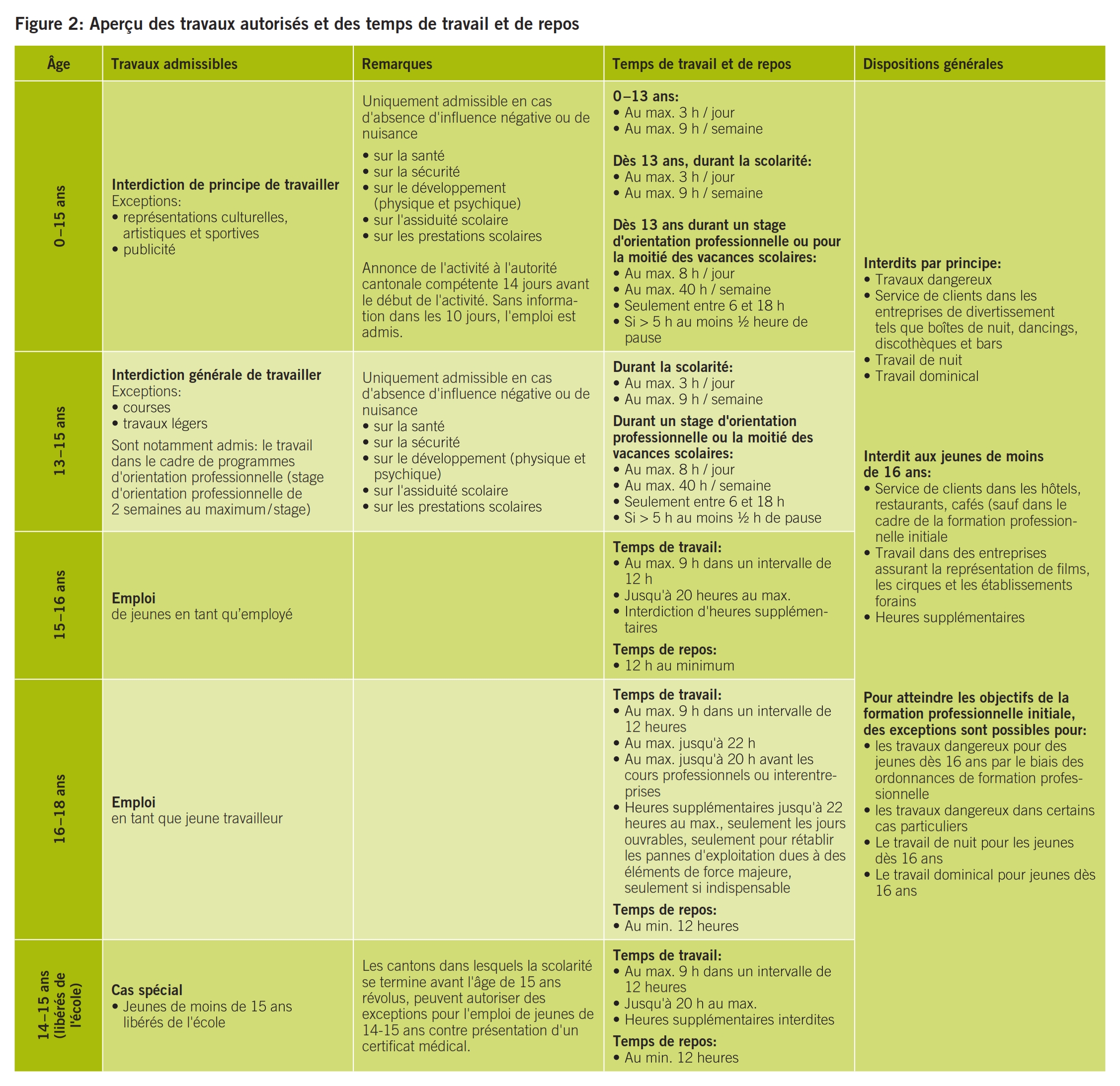 Une interdiction de travail générale s’applique aux jeunes de moins de 15 ans révolus. De cette interdiction sont exceptés des courses ou des travaux légers pour les jeunes de plus de 13 ans («places hebdomadaires») ainsi que des travaux dans le cadre de manifestations culturelles, artistiques ou sportives ainsi que dans la publicité pour les jeunes de moins de 15 ans. De plus, les cantons peuvent autoriser des dérogations pour les jeunes gens de plus de 14 ans et libérés de l’école (art. 30 LTr).