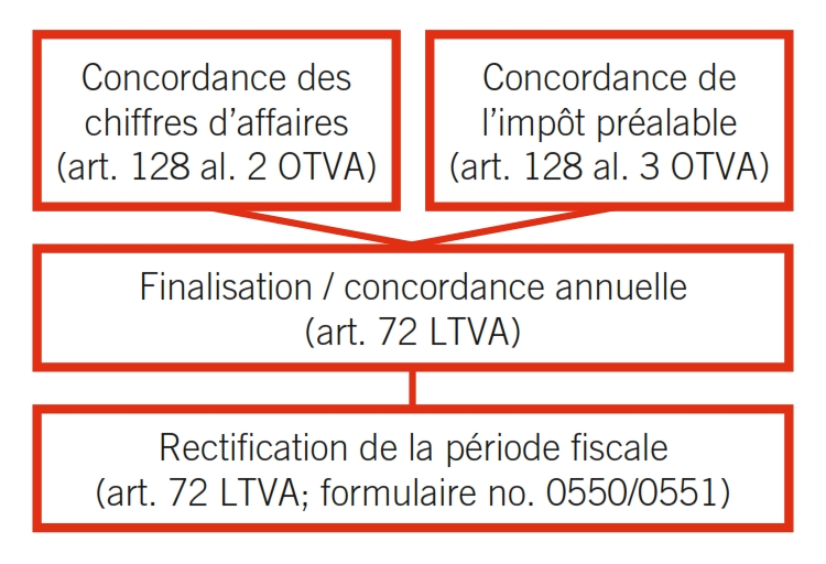 Les auteurs estiment que les deux concordances que prescrit la loi peuvent être désignées d’instruments destinés à la finalisation, comme l’illustre graphiquement la figure. A son tour, la finalisation ou la correction de différences en résultant dans les déclarations est expliquée à l’art. 72 LTVA, une nouvelle disposition dans la loi – en soi simplifiée – sur la TVA qui, à première vue, provoque une dépense de travail supplémentaire auprès de l’assujetti. Cela peut être exact, mais il y a lieu d’observer également que les concordances des chiffres d’affaires et de l’impôt préalable étaient déjà prescrites sous l’ancien régime de la TVA au niveau administratif. Avec la nouvelle loi sur la TVA, l’assujetti y est certes obligé, au niveau de la loi et de l’ordonnance, mais il obtient en contrepartie la possibilité de vérifier ses déclarations de TVA remises pendant l’année et d’annoncer postérieurement d’éventuelles différences, sans pénalités et sans intérêt moratoire – et ce dans un délai approprié de 180 ou de 240 jours à compter de la clôture de l’exercice commercial. Les diverses déclarations de TVA doivent toujours être remises correctement et complètement, mais les éventuels défauts non reconnus peuvent dorénavant être déclarés postérieurement, de manière simple, au moyen des formulaires 0550 et 0551 (personnes assujetties aux taux de la dette fiscale nette et aux taux forfaitaires). Le nouveau formulaire correspond, dans sa structure, à celui d’un décompte de TVA.