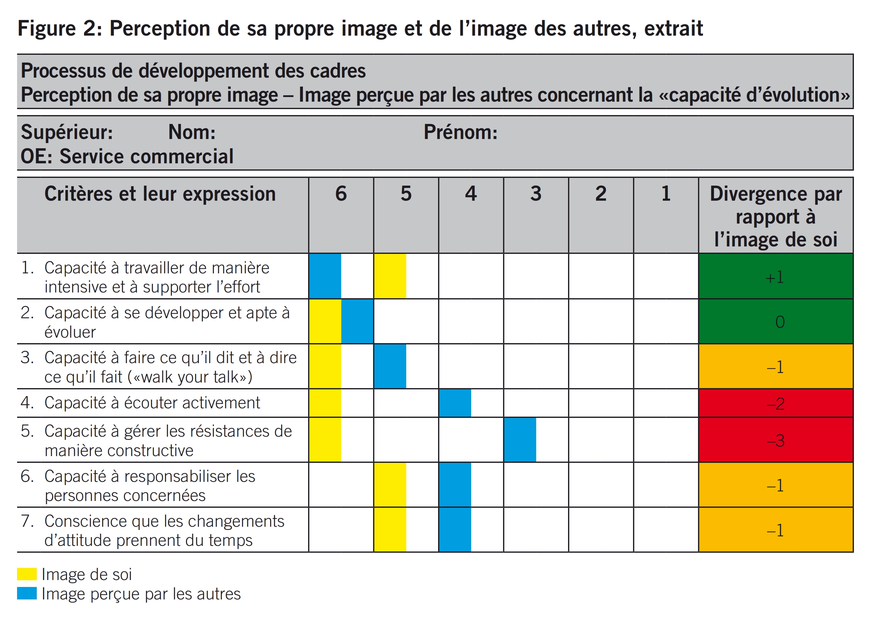 La perception de sa propre image et l’image perçue par les autres – notamment concernant la capacité d’évolution – a été un élément important du concept de développement des cadres. Celui-ci exigeait que le directeur commercial, comme tous les autres cadres, brosse son propre portrait, qui était ensuite complété par la perception de ses subordonnés directs (voir figure 2).
