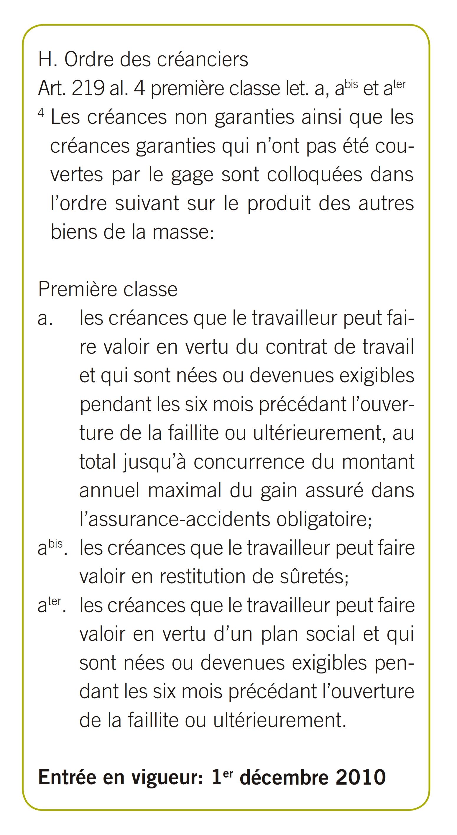 Fondamentalement, les créances des travailleurs en vertu de plans sociaux sont traitées comme toutes les autres créances résultant des rapports de travail, et ce même après l’entrée en vigueur de l’art. 219 al. 4 LP. Ainsi, un privilège en première classe ne reste possible également pour des créances en vertu de plans sociaux que si les créances ne sont pas nées ou devenues exigibles plus tôt que six mois avant l’ouverture de la faillite. Toutefois, à l’instar de la prétention du travailleur en restitution de sûretés, les créances des travailleurs en vertu de plans sociaux ont également été exceptées de la limitation nouvellement créée du privilège à un montant maximum.20 Partant, il ne s’opère aucun changement non plus pour les créances de travailleurs en vertu de plans sociaux avec l’entrée en vigueur des nouvelles règles en date du 1er décembre 2010. Cependant, leur privilège sera désormais stipulé expressément dans une nouvelle let. ater nouvellement créée.
