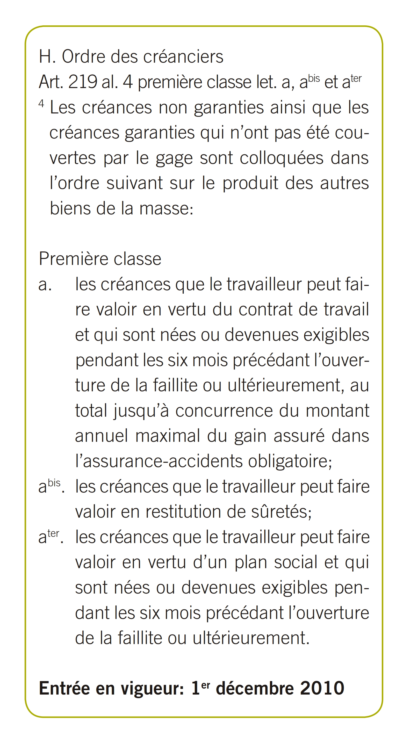 A certaines conditions, les créances des travailleurs bénéficient, dans la faillite de l’employeur, d’un traitement privilégié, par le fait qu’elles sont satisfaites avant les créances des autres créanciers. Dès le 1er décembre 2010, ce privilège du travailleur sera limité par une reformulation de l’art. 219 LP.
