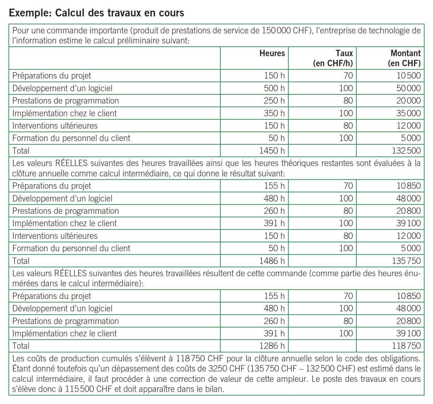 Les travaux en cours doivent être évalués selon l’art. 960a al. 1 CO dans la première évaluation des coûts de fabrication. En cas de travaux en cours, les frais de personnel ainsi que d’autres frais de tiers liés à un projet doivent être présentés en plus des coûts de fabrication. Les frais généraux d’administration et de distribution ne doivent pas être inclus dans les travaux en cours. Les frais de distribution peuvent inclure les coûts directs qui sont étroitement liés à un projet. En principe, conformément à l’art. 960 al. 1 CO, les travaux en cours doivent être évalués séparément. Il est possible de déterminer au cas par cas et selon l’ensemble des circonstances si une évaluation groupée des travaux en cours est applicable ou autorisée.